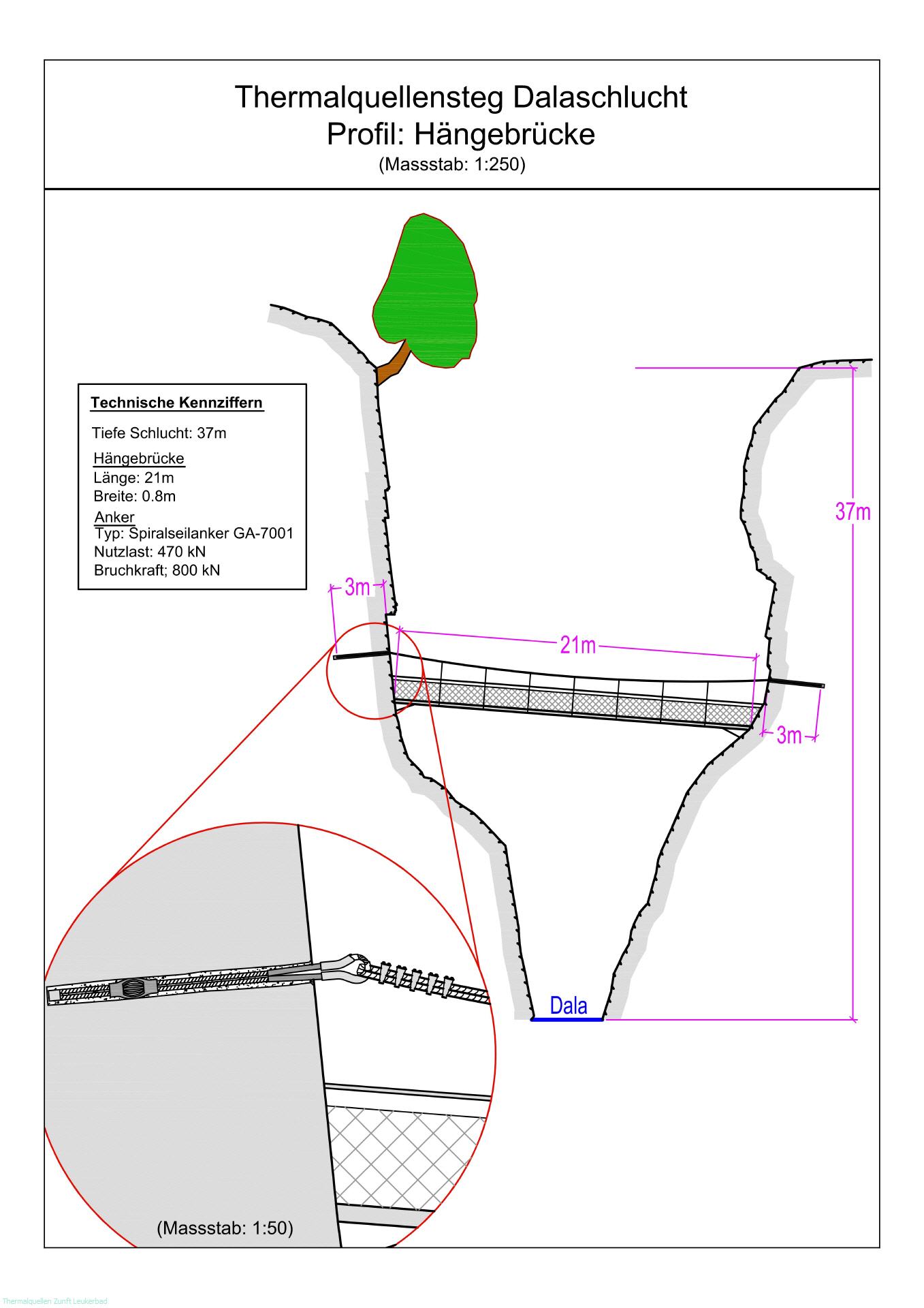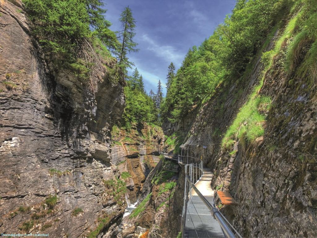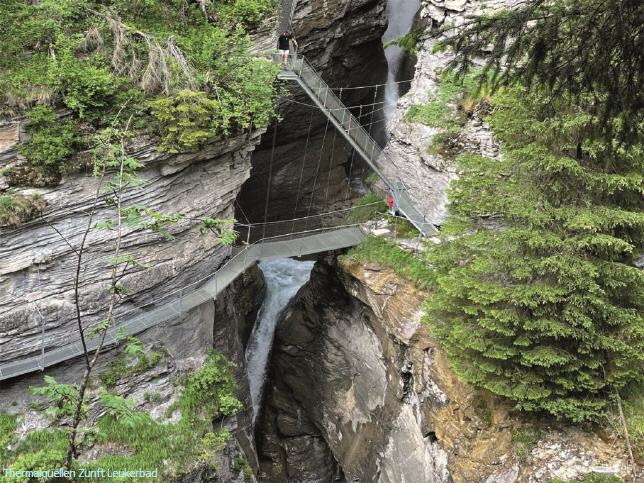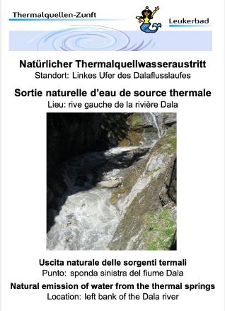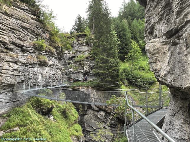 Der 600 Meter lange Thermalquellen-Steg, führt Sie in gut 30 Minuten durch die wilde, tosende Dala-Schlucht. Zwei steile Treppen hoch, entlang des stiebenden Wasserfalls erreichen Sie zu Fuss den Oberlauf der Dala-Schlucht. Der Thermalquellen-Steg geht dann ins bestehende Wanderwegnetz über. Der Thermalquellen-Steg ist von Mai bis Oktober begehbar. Sie begehen den Thermalquellen-Steg "Dala-Schlucht" immer auf Ihre eigene Verantwortung. Bei Unfällen lehnt die Thermalquellen-Zunft jede Haftung ab.